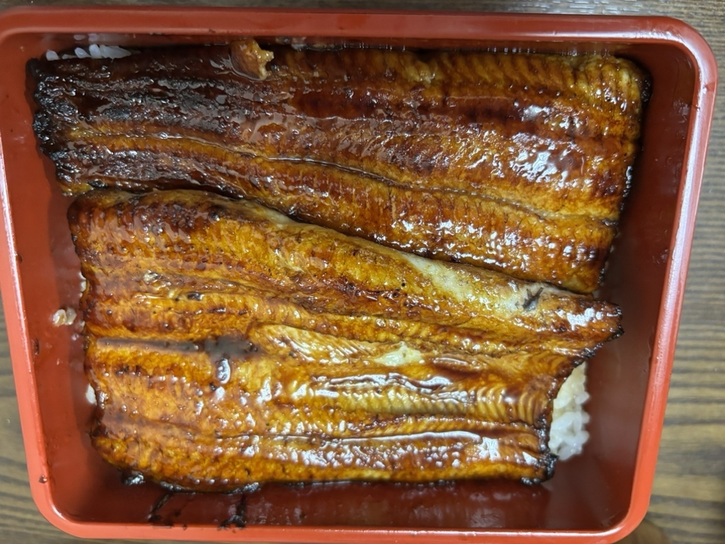 鰻は鰻重にしたが、白焼分も予約しておけば良かったと後悔したが,追加は出来ないので後の祭り。鰻重はまずは,鰻の豊満さに圧倒された.これまでに食べたものの中で一番身が大きく厚い.これが重なる様にお重に収まっていて,ご飯が壁の様に透けて見えてしまう貧相さがないところが心を満たす。タレは甘すぎず、醤油味のトゲもなく丁度良い.ご飯の量は少なめだが、鰻のボリュームで,お腹いっぱいになった。